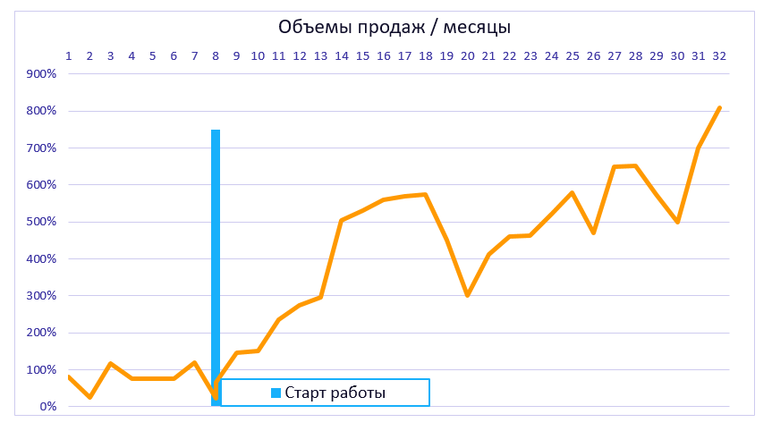 • Рост продаж через 3 месяца – 60%, через 7 месяцев – в 8 (восемь!) раз.